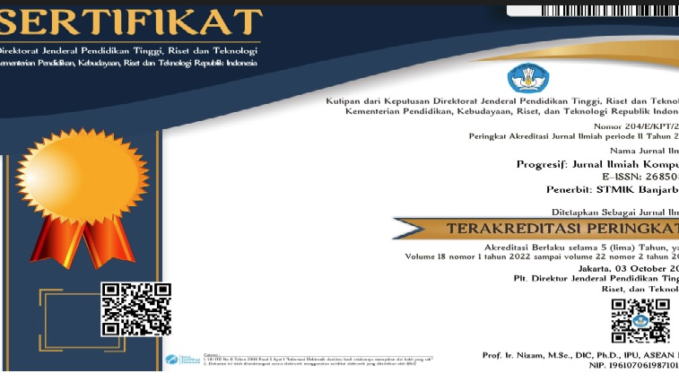 Progresif: Jurnal Ilmiah Komputer adalah jurnal ilmiah yang diterbitkan oleh STMIK BANJARBARU. Terbit 2 edisi dalam satu tahun, yaitu bulan Februari dan Agustus. Jurnal ini terindeks Google Scholar dan Portal Garuda dengan akreditasi SINTA 4.